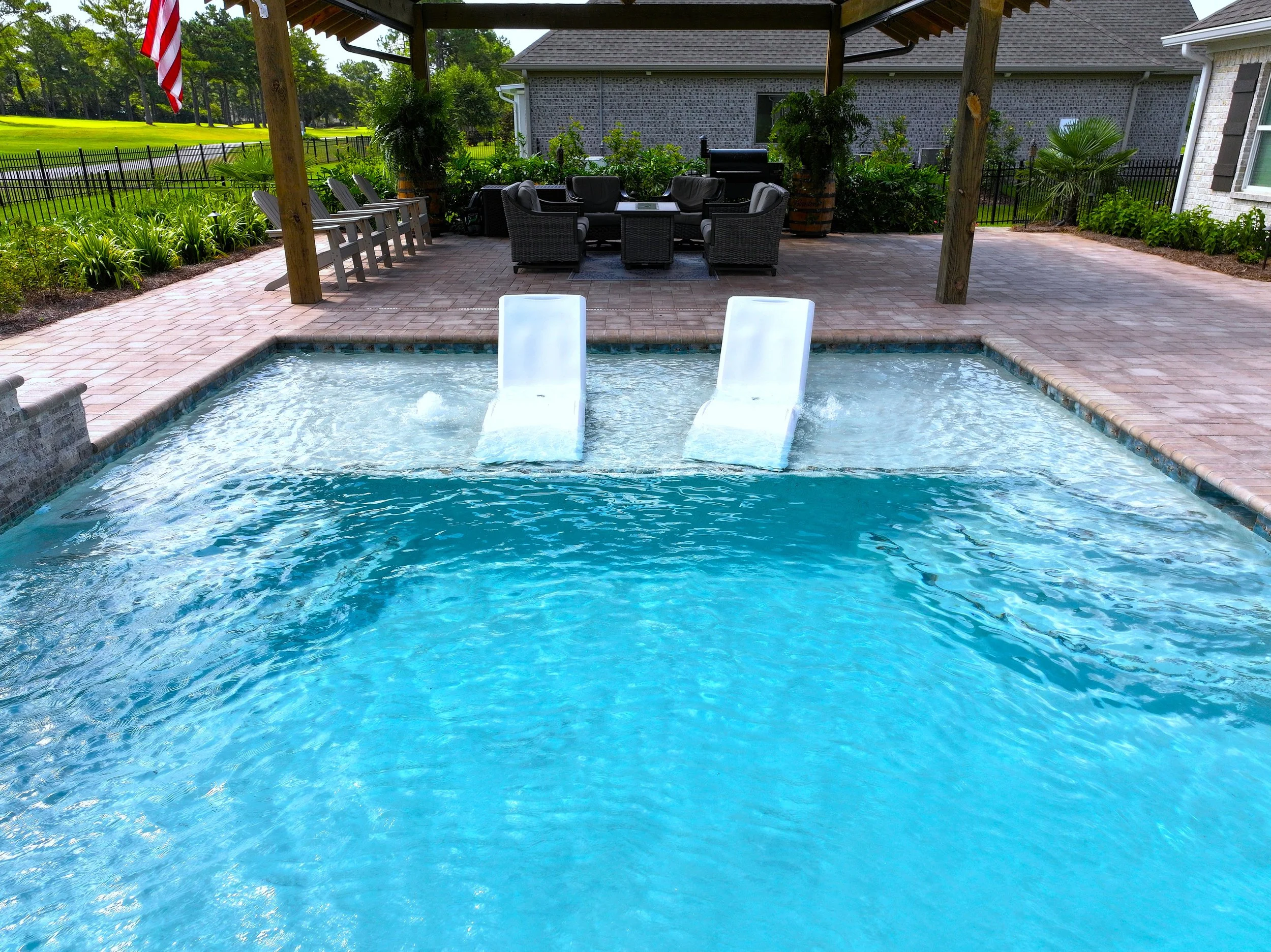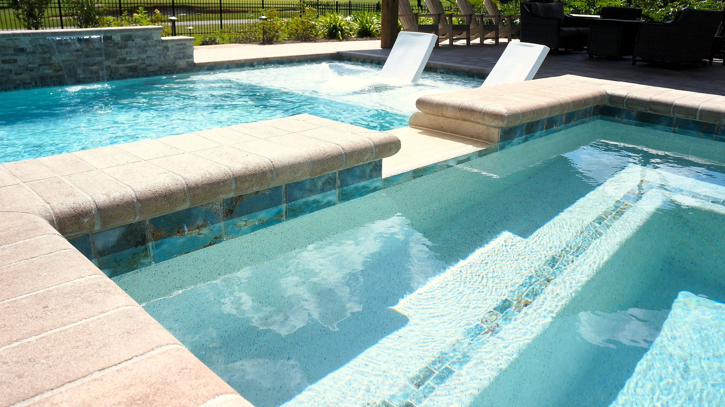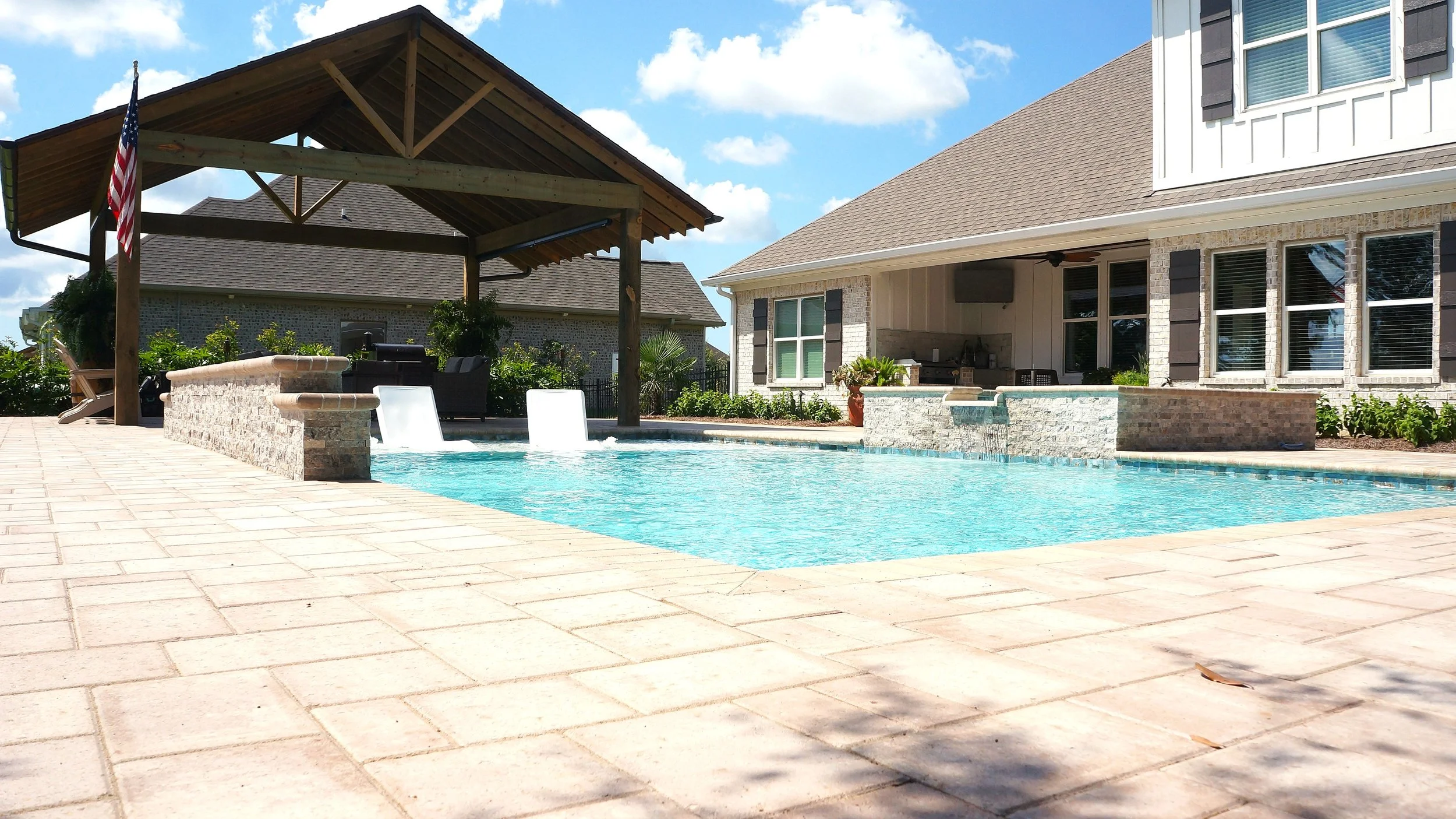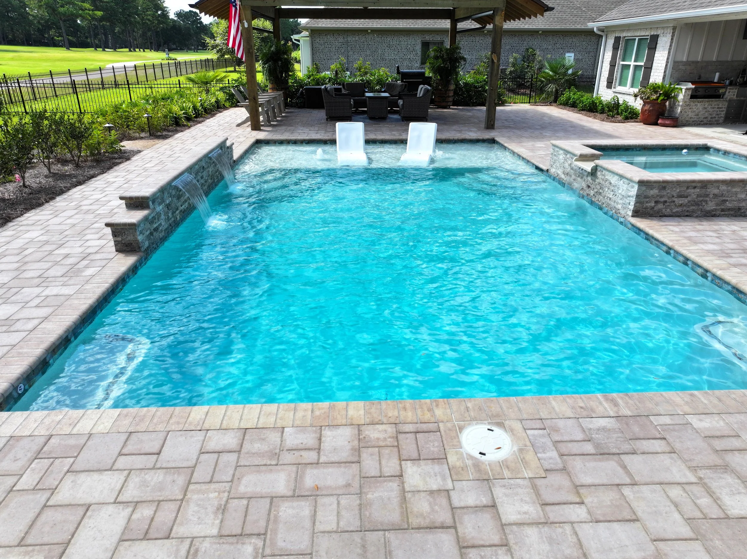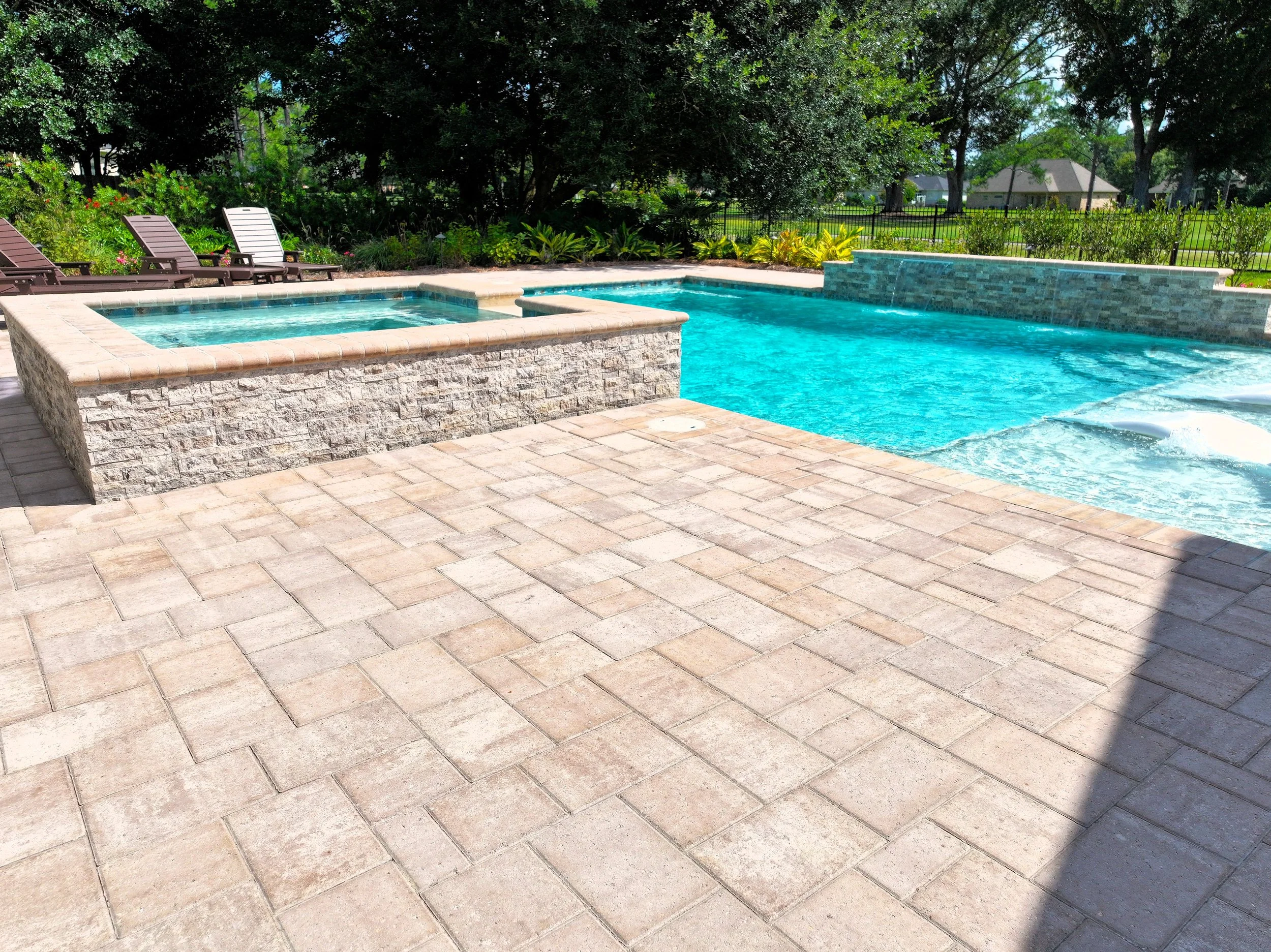 A geometric pool and spa sanctuary with dual sheer descent water feature wall, a raised split-travertine spa with spillover, and a tanning ledge with bubblers — complemented by a custom gazebo, lush landscaping, pebble interior finish, and full automation. Completed in just one month, this saltwater escape features bullnose coping, trim tile details, and a French-pattern paver deck that elevates outdoor living to resort status.