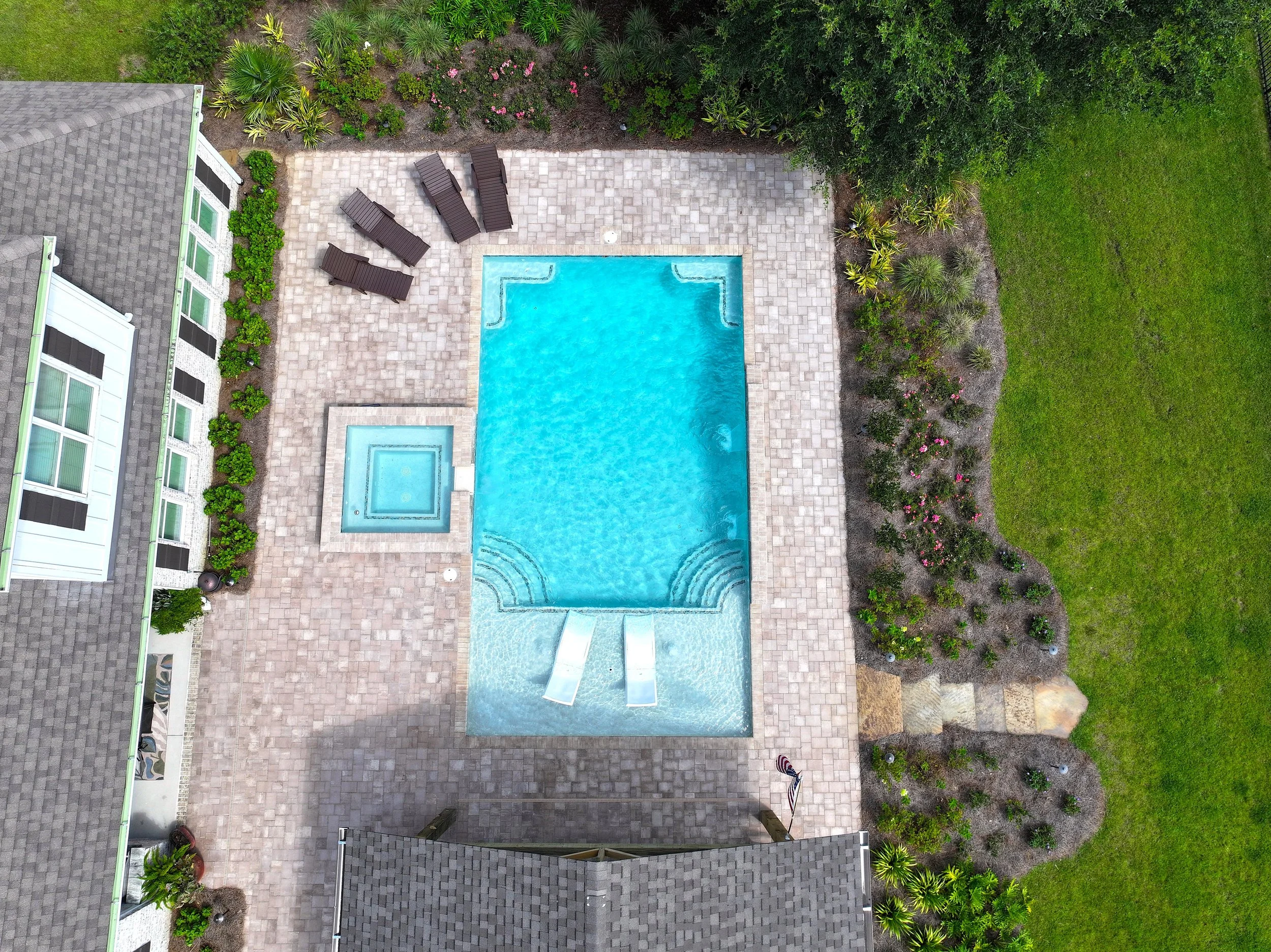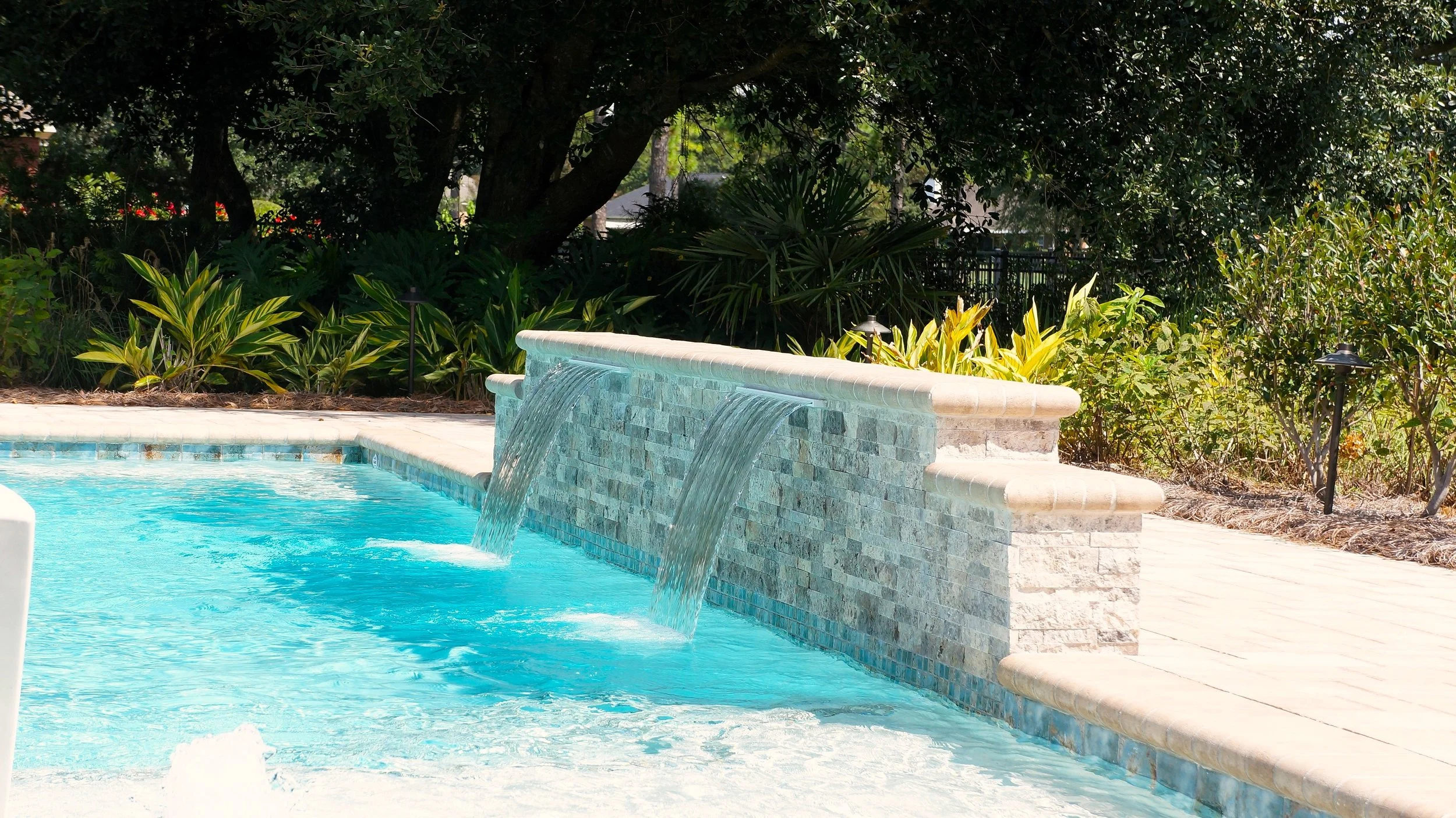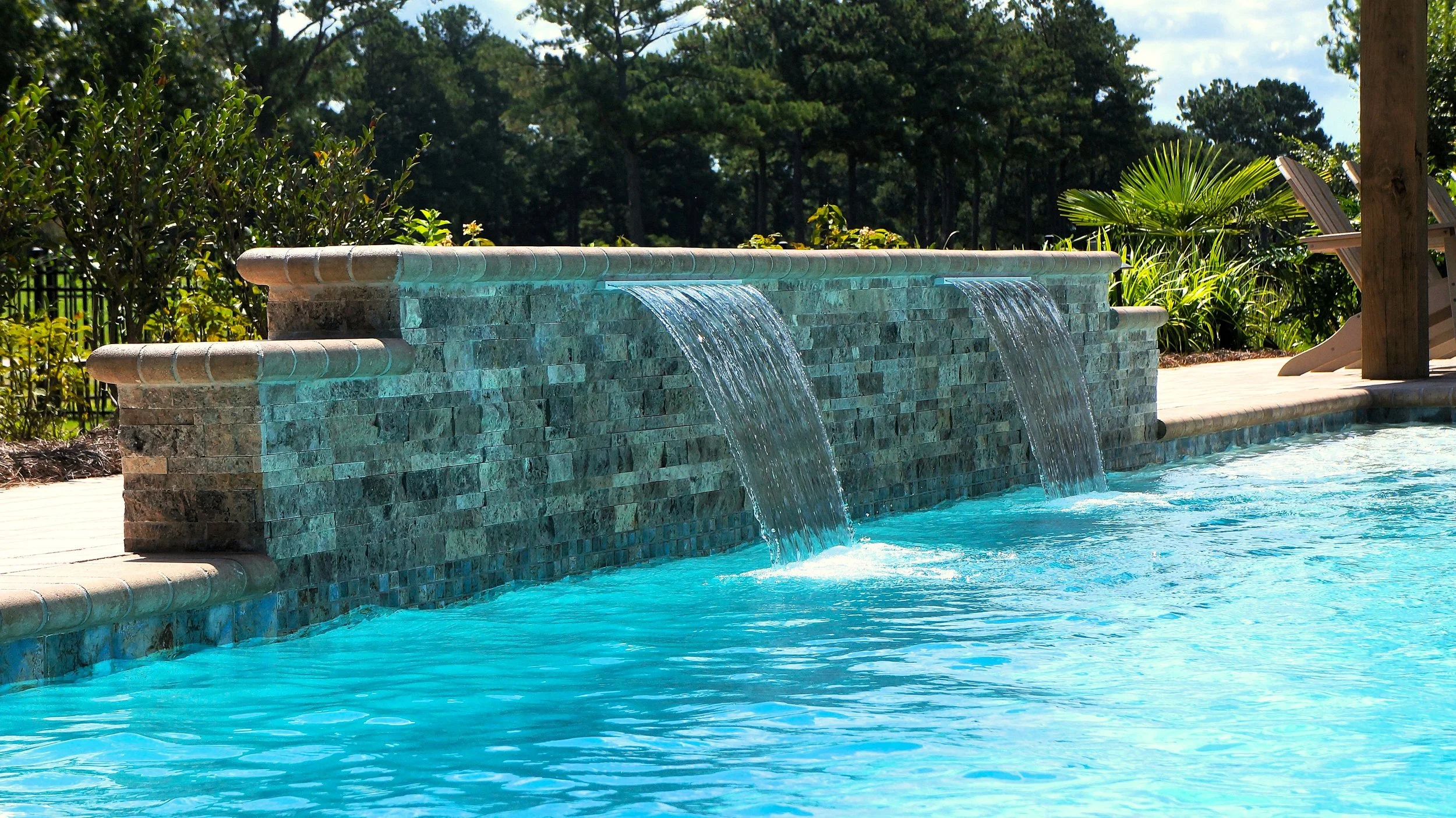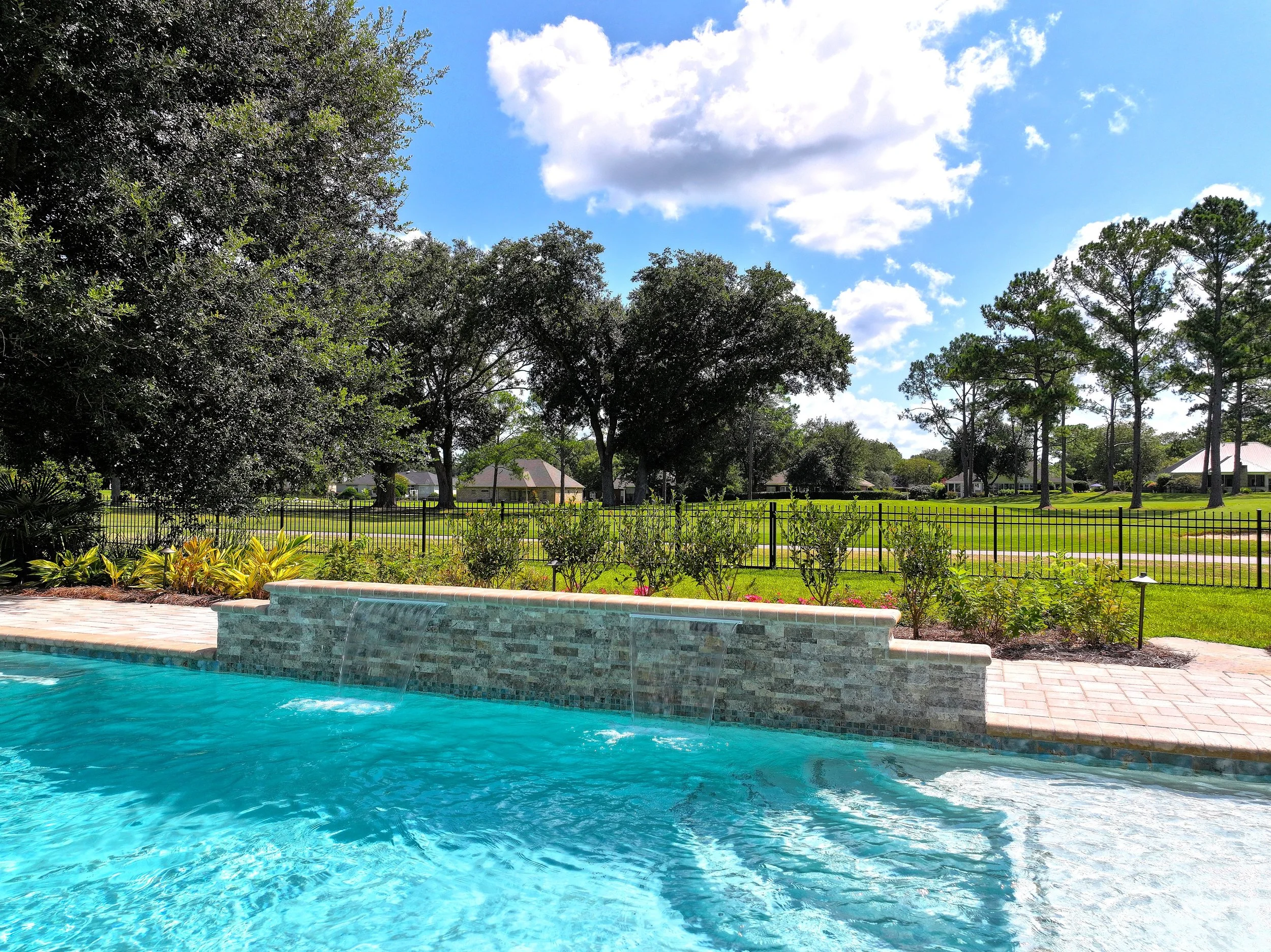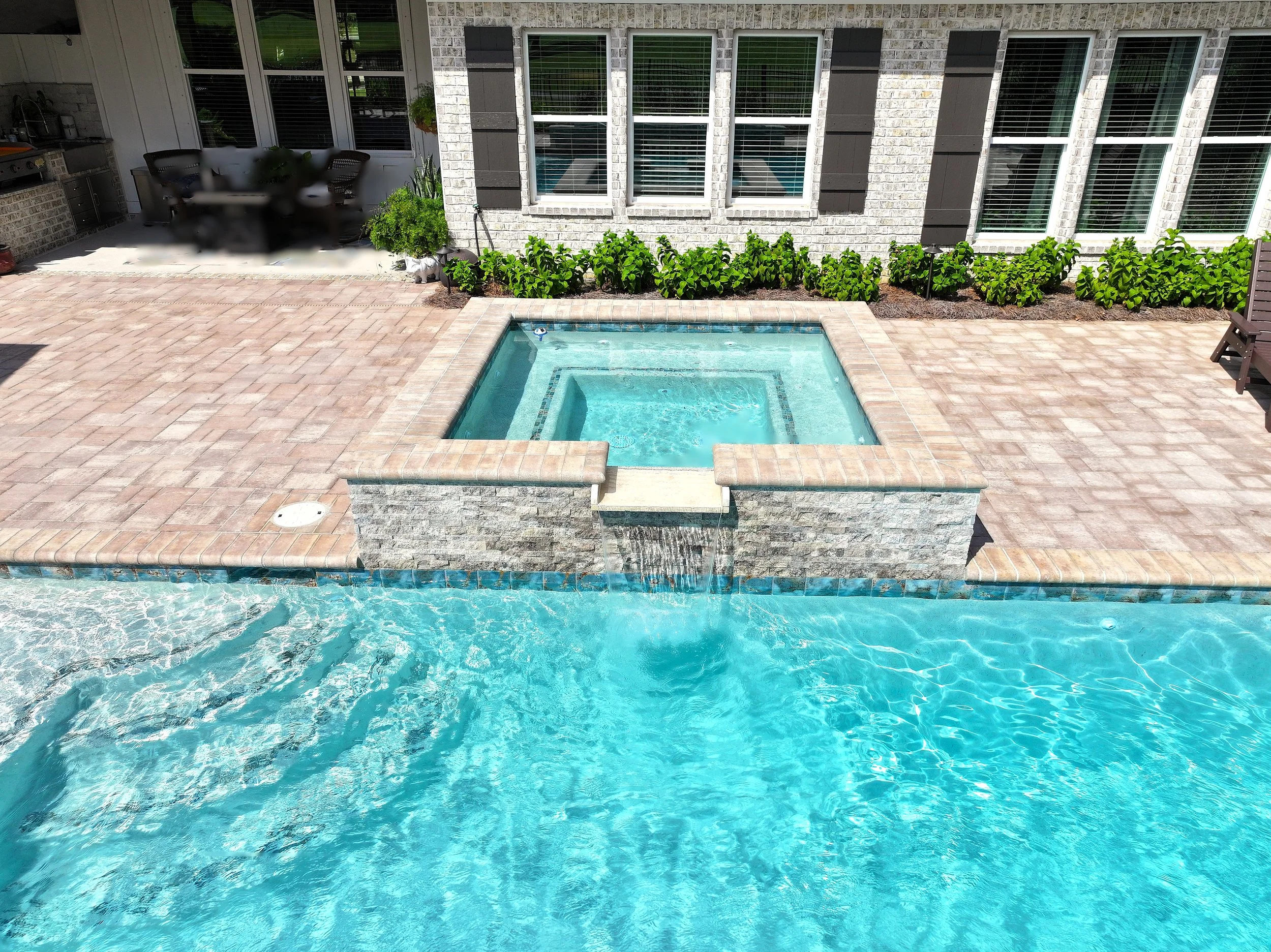 A geometric pool and spa sanctuary with dual sheer descent water feature wall, a raised split-travertine spa with spillover, and a tanning ledge with bubblers — complemented by a custom gazebo, lush landscaping, pebble interior finish, and full automation. Completed in just one month, this saltwater escape features bullnose coping, trim tile details, and a French-pattern paver deck that elevates outdoor living to resort status.