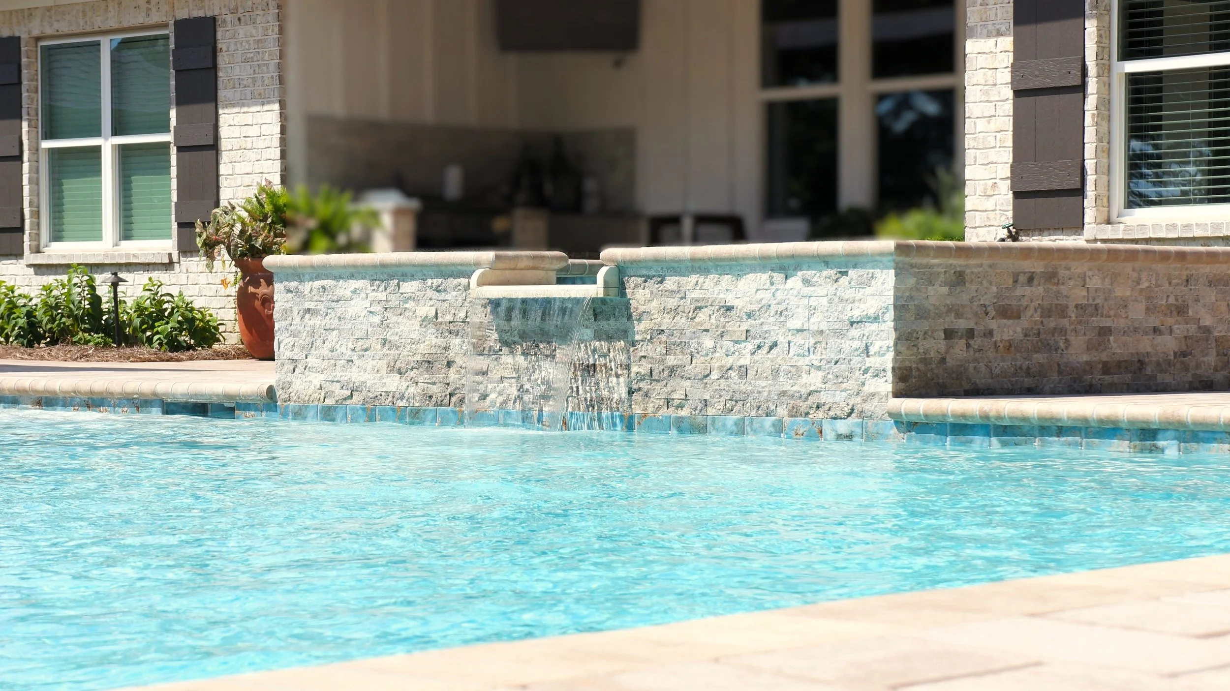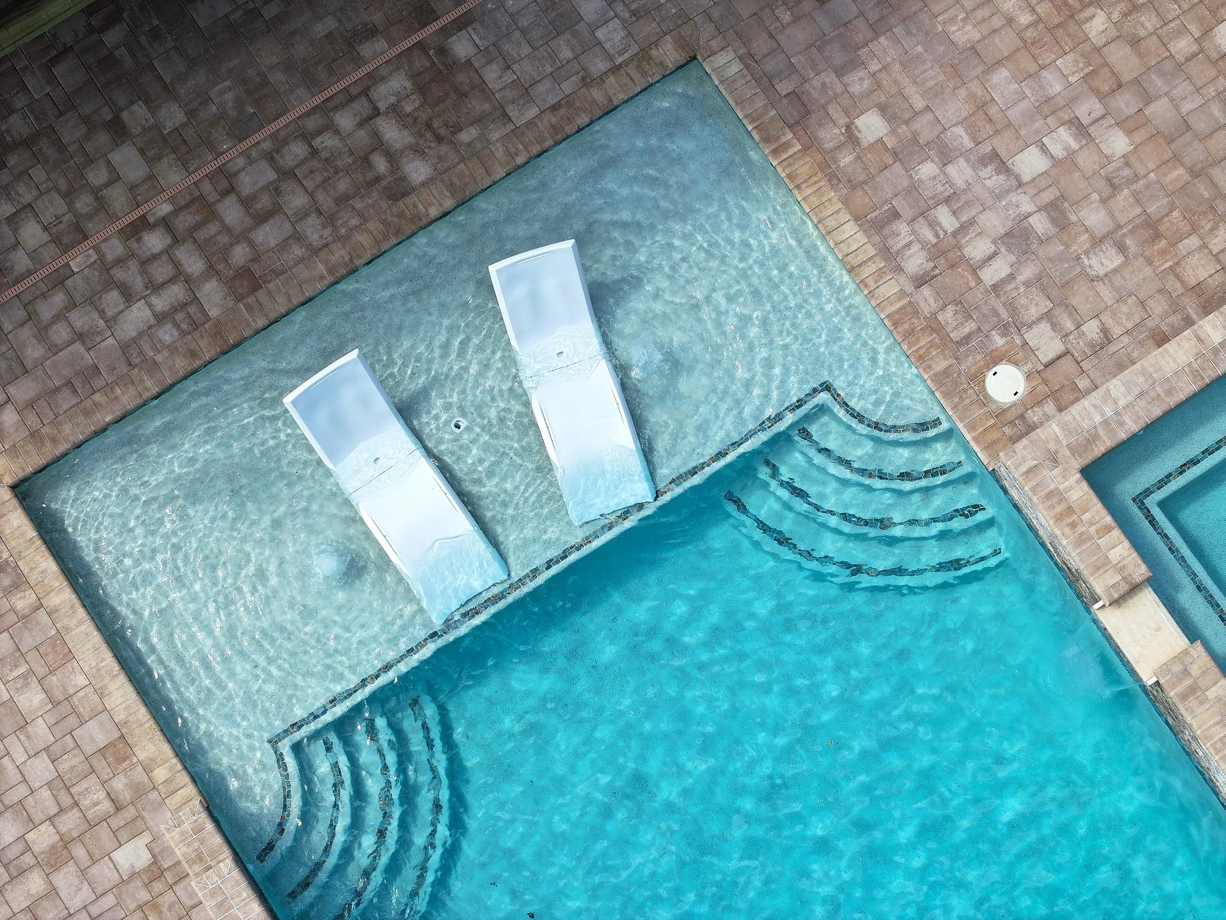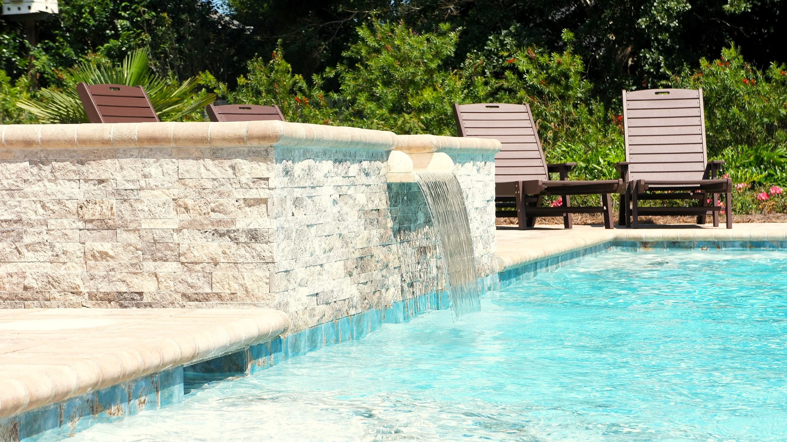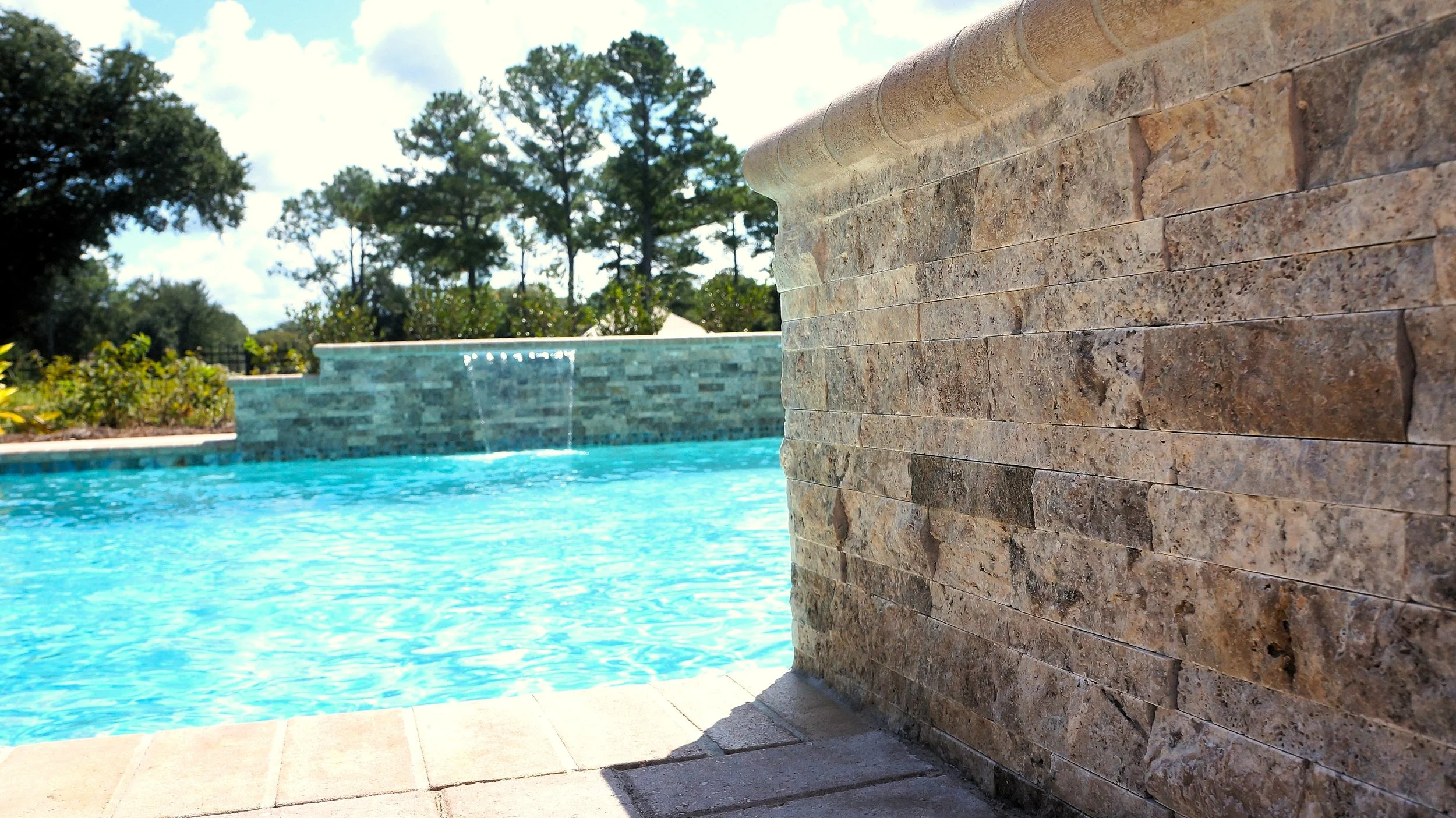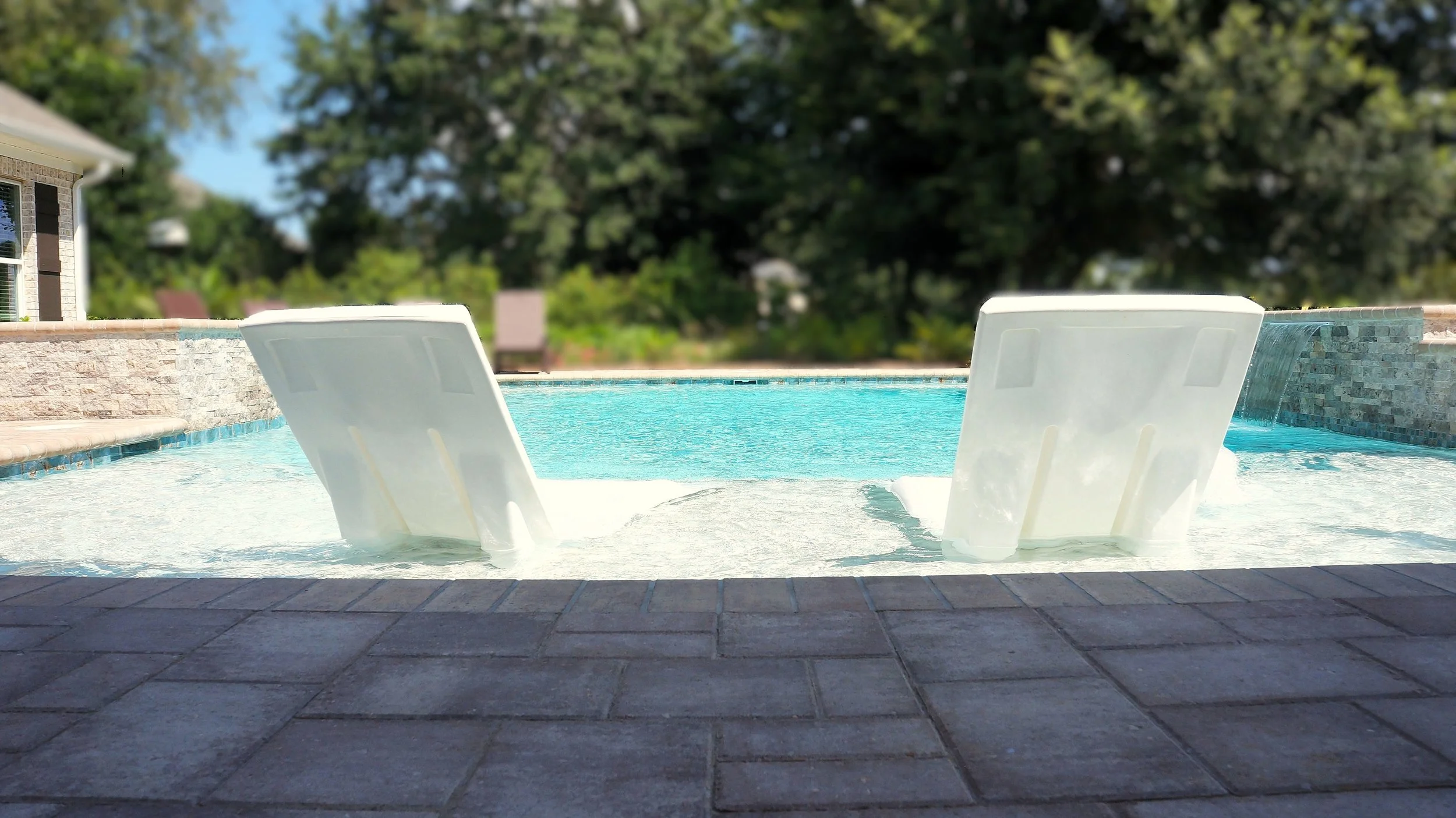 A geometric pool and spa sanctuary with dual sheer descent water feature wall, a raised split-travertine spa with spillover, and a tanning ledge with bubblers — complemented by a custom gazebo, lush landscaping, pebble interior finish, and full automation. Completed in just one month, this saltwater escape features bullnose coping, trim tile details, and a French-pattern paver deck that elevates outdoor living to resort status.