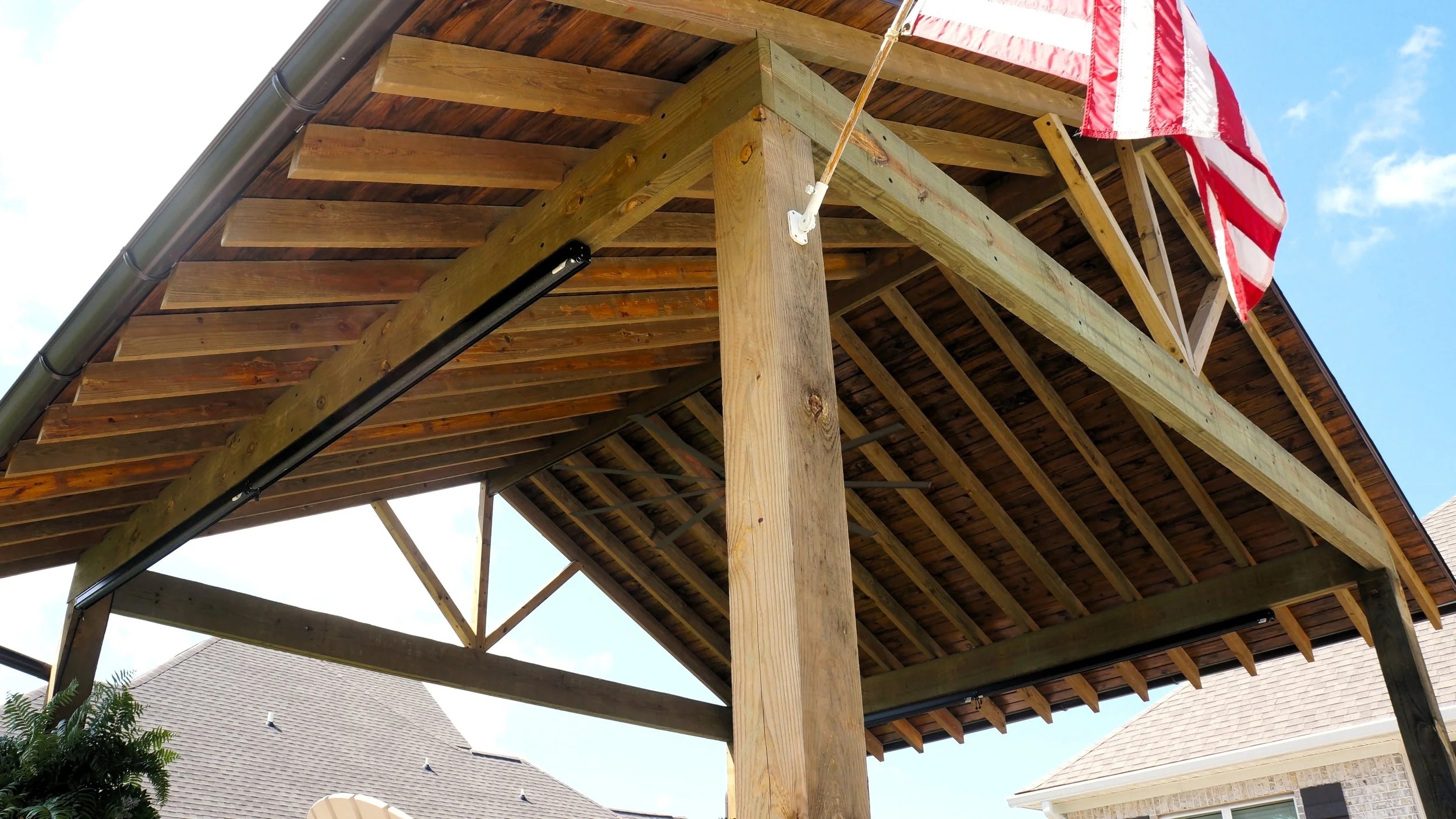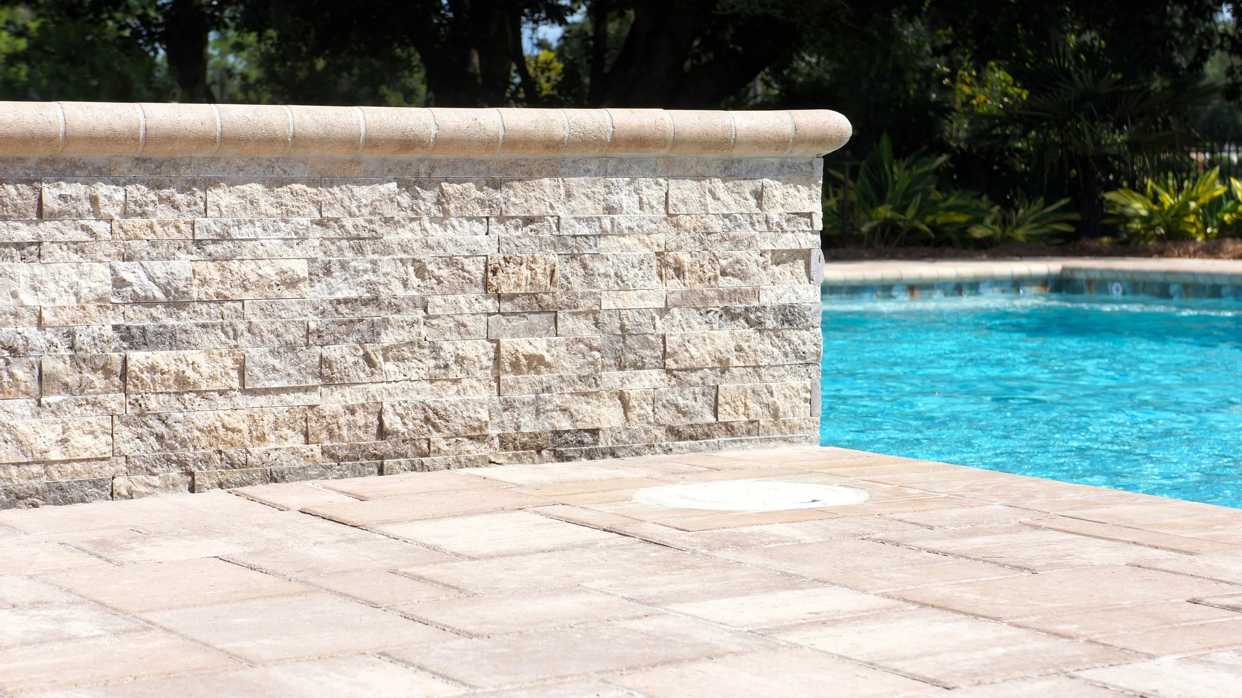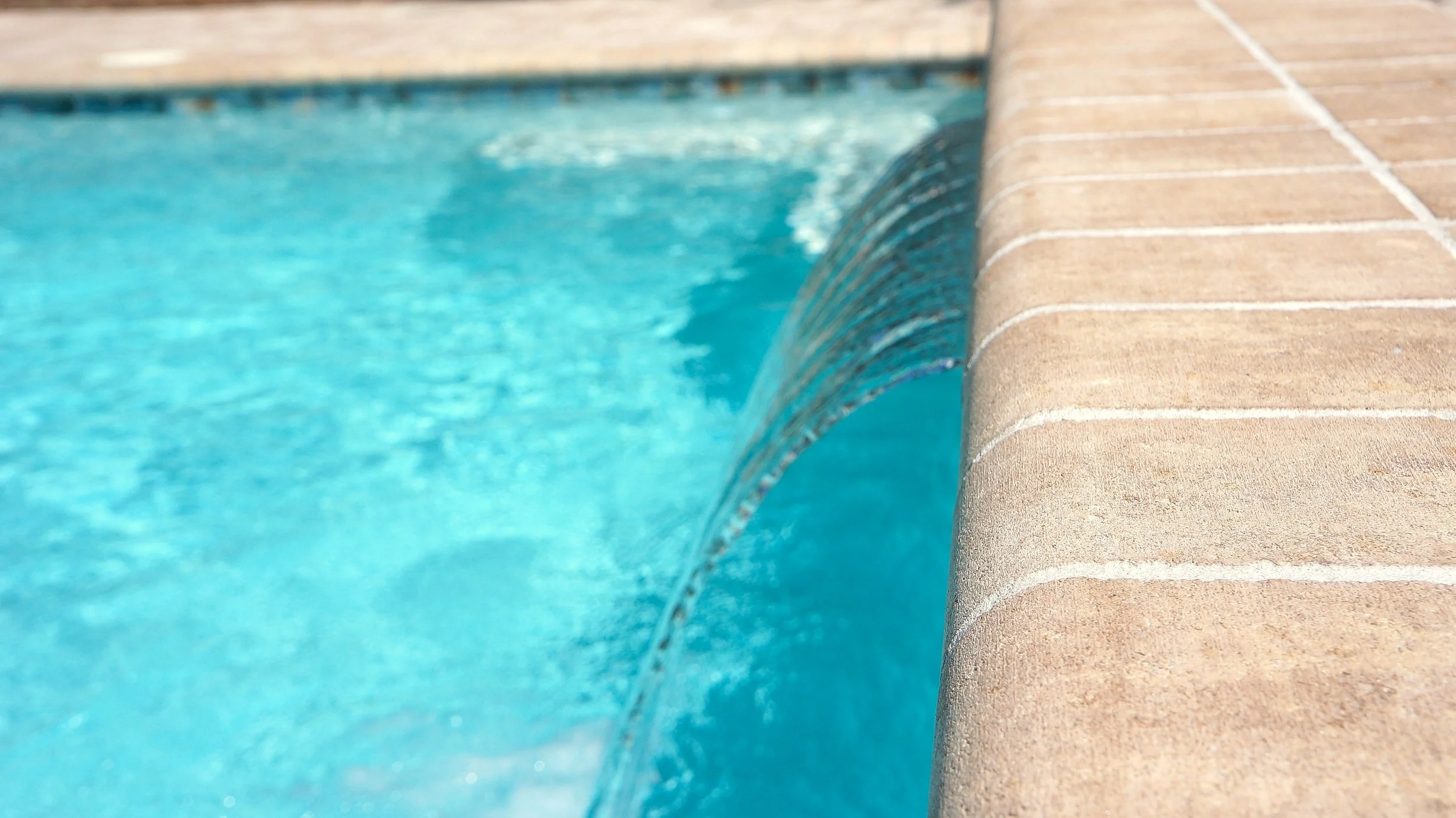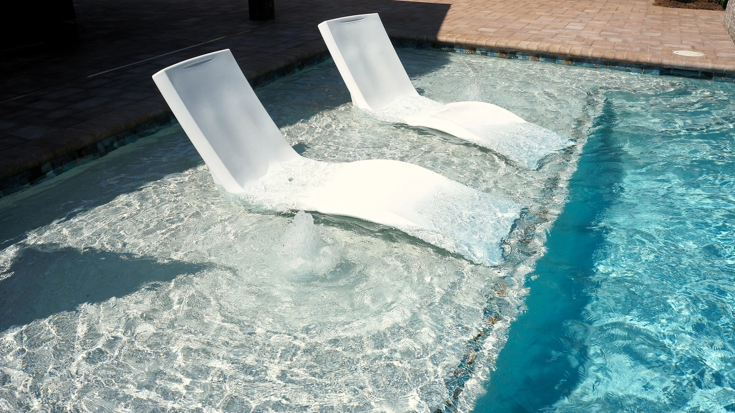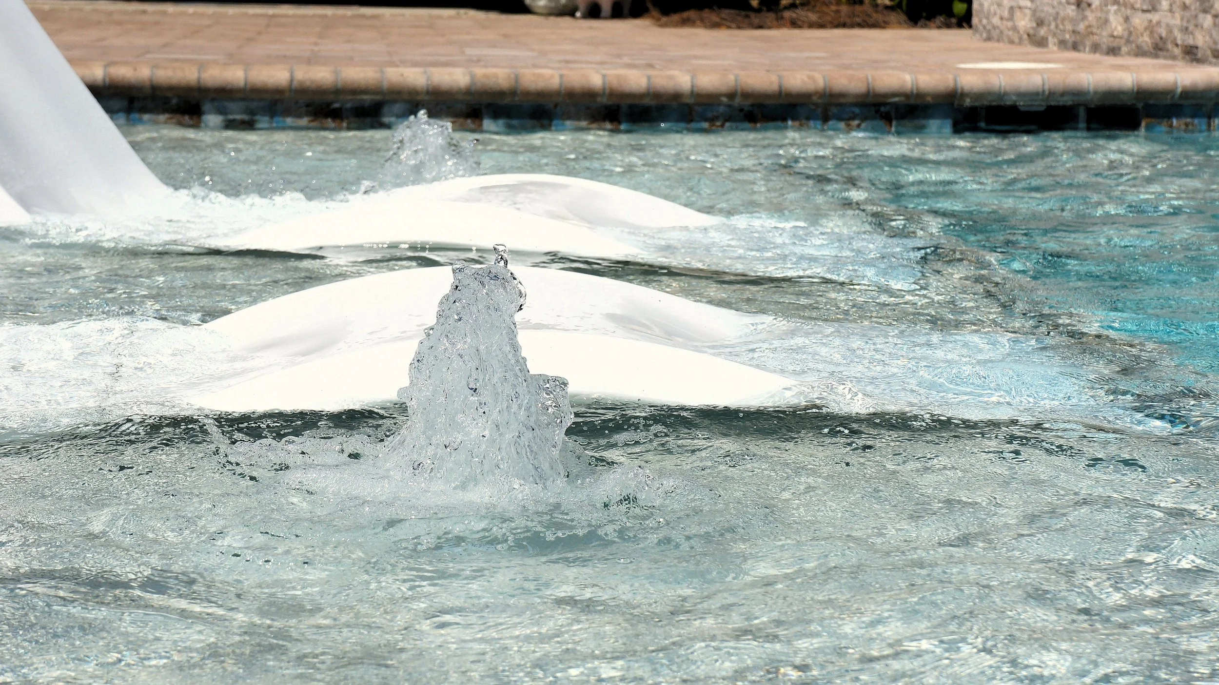 A geometric pool and spa sanctuary with dual sheer descent water feature wall, a raised split-travertine spa with spillover, and a tanning ledge with bubblers — complemented by a custom gazebo, lush landscaping, pebble interior finish, and full automation. Completed in just one month, this saltwater escape features bullnose coping, trim tile details, and a French-pattern paver deck that elevates outdoor living to resort status.